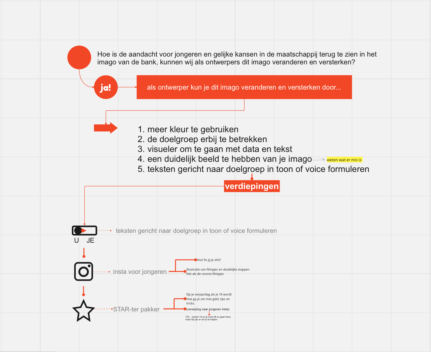 Ontwerp: Eerst hebben wij dieper onderzoek gedaan naar de vraag; Want wat zijn gelijke kansen eigenlijk? Wat valt onder jongeren? Welke subculturen zijn er? Wat is inclusiviteit? Vanuit dit onderzoek concluderen wij dat wij als ontwerper zeker in de positie staan om het imago te kunnen veranderen. Om de verdieping verder op te zoeken hebben wij ervoor gekozen om 3 verschillende voorstellen te doen. 1. De tone of voice op de website van ABN amro veranderen naar een toon die beter past bij een jongere generatie. 2. Instagram voor jongeren, waarin de doelgroep wordt aangesproken door de bank. 3. STAR-ter pakket. Hierin kom je in contact met de bank als er zelf een keuze moet worden gemaakt bij welke bank jij wilt horen.