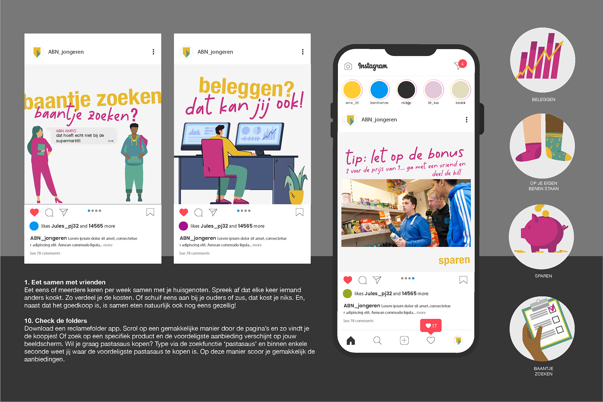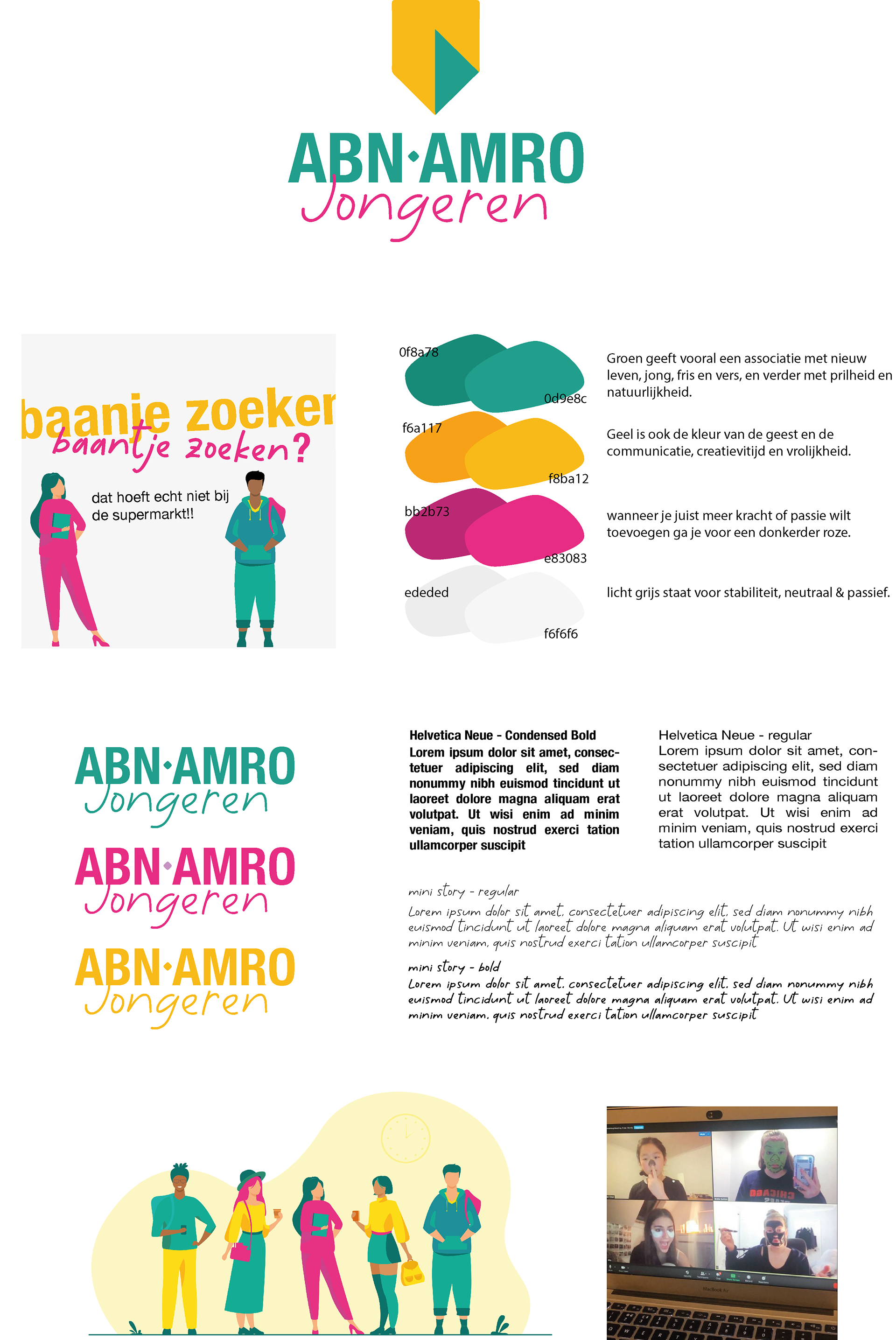 Resultaat: Tijdens onze presentatie van de 3 verschillende voorstellen benoemde ABN amro dat wij inderdaad een vinger op de zere plek drukte. ABN amro wil vanuit onze ideeën meer gaan doen met illustraties maar gaven aan het lastig te vinden. Wij hebben ze met ons idee enorm geïnspireerd om meer gebruik te maken van zowel beeld als taal die jongeren meer aan spreekt.